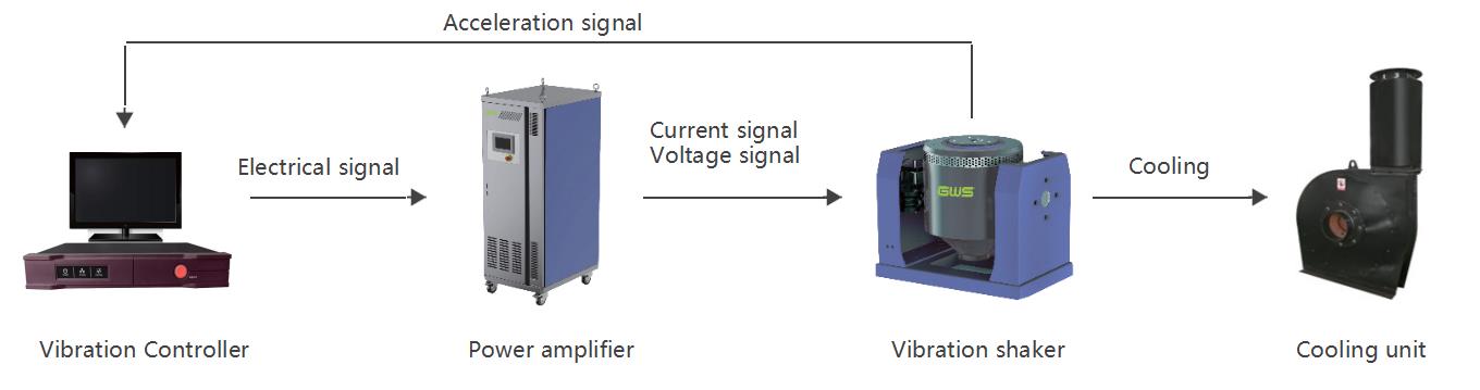 El sistema de prueba de vibración electrodinámica es un sistema de control de bucle cerrado típico compuesto por un vibrador, un amplificador de potencia, un controlador de vibración, una unidad de refrigeración y un instrumento de medición (por ejemplo, un acelerómetro), etc.